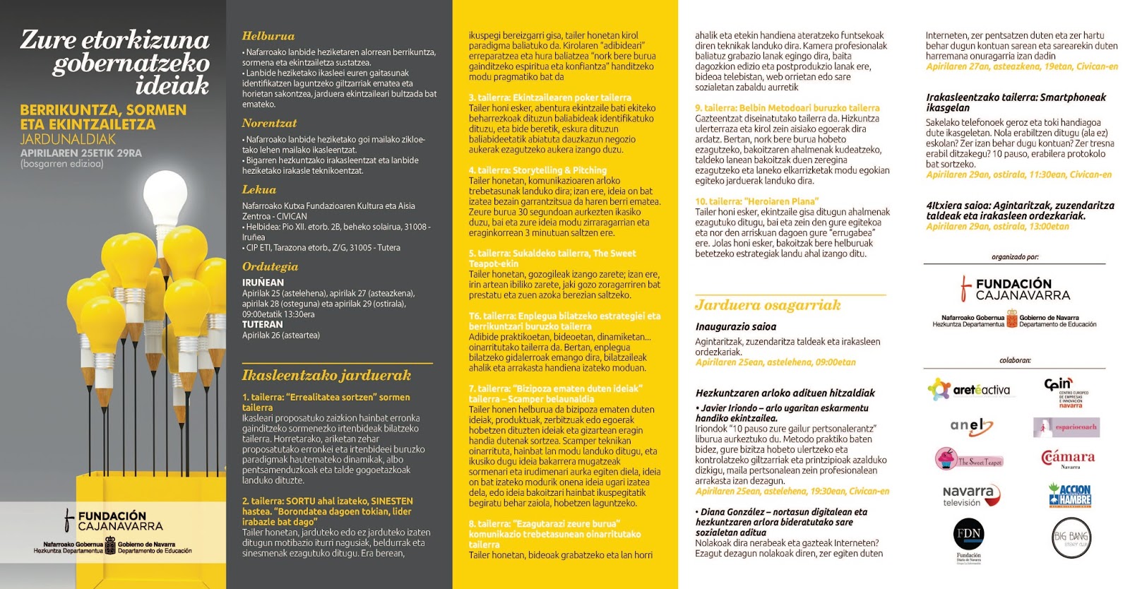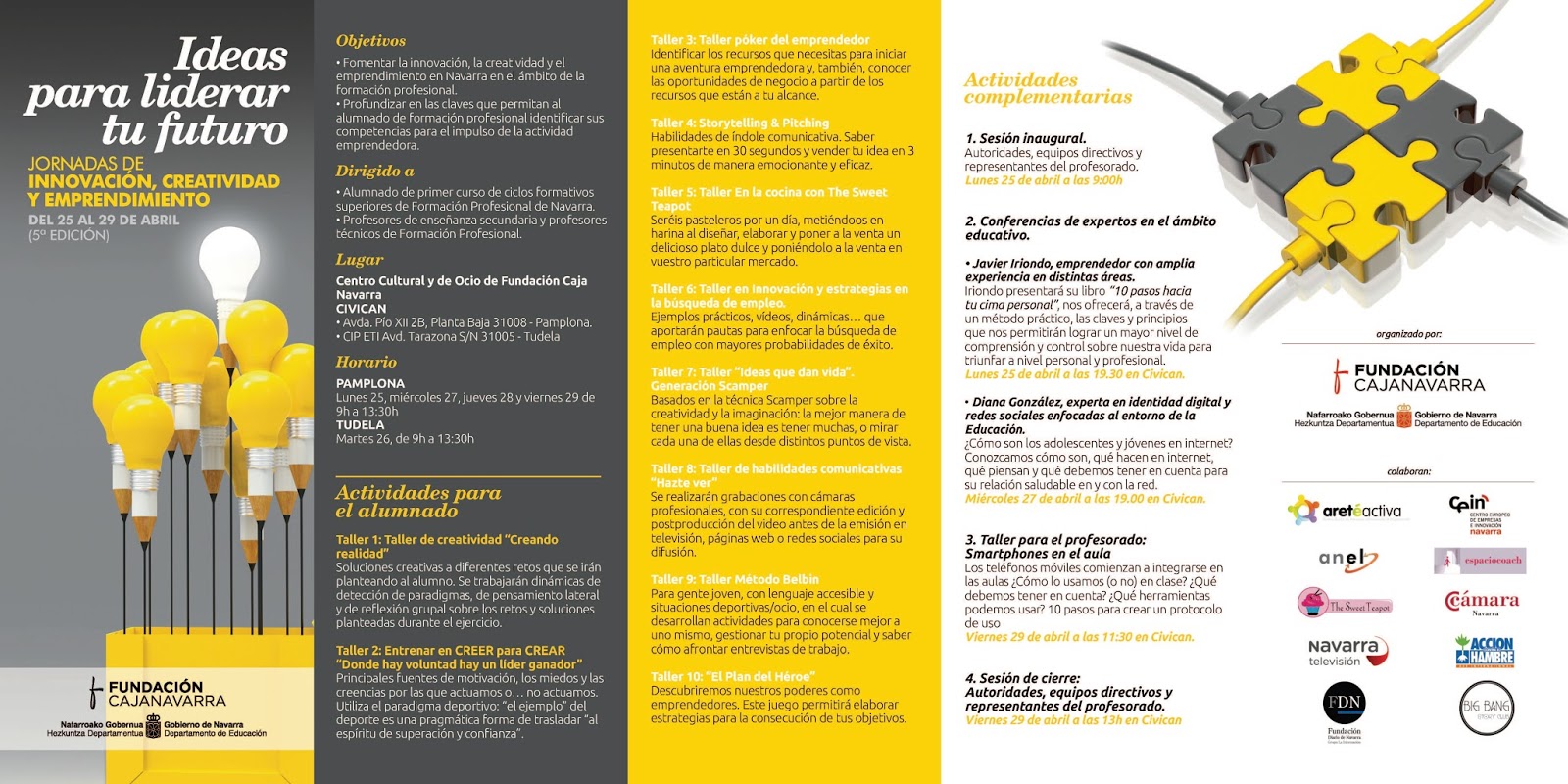 Fundación Caja Navarra y Gobierno de Navarra organizan por quinto año las Jornadas de innovación, creatividad y emprendimiento dirigidas a estudiantes de ciclos formativos superiores de Formación Profesional de Navarra y docentes. Este año, del 25 al 29 de abril y bajo el lema Ideas para liderar tu futuro, se realizarán diversos talleres, conferencias y talleres para ambos públicos.