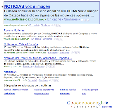 Conforme bajas en los resultados hace un pequeño ruido para guiarnos por donde vamos y al llegar al final, si vulve a subir, cambia el tono del sonido. Si no manejamos el ratón (puesto que no nos facilita ampliar la letra ni enmarcarla al posicionar el cursor encima), únicamente nos permite navegar por las noticias, no por los enlaces patrocinados (supongo porque no estarán adaptados para las personas con un porcetanje de ceguera), aunque pulsando ALT (en mac) nos permie llegar a ellos y a buscar en otros formatos: imágenes, videos, blogs…